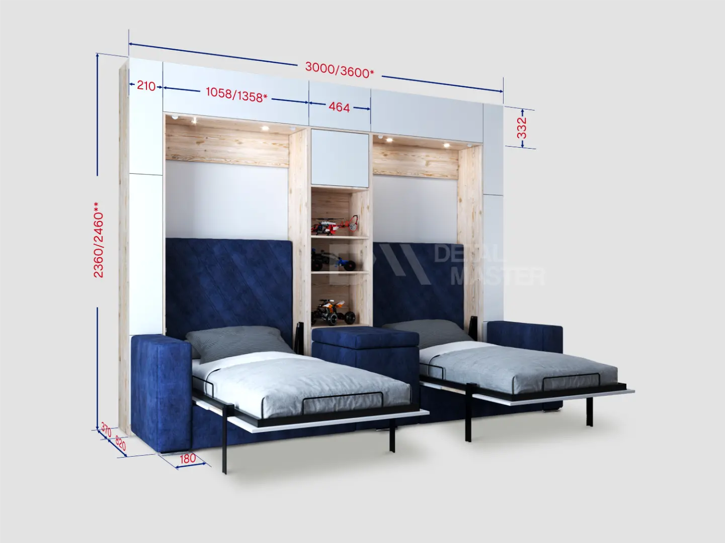 Дополнительные опции, такие как: освещение, зарядное устройство, розетки, мягкое изголовье, матрас, мягкий борт - не входят в стоимость шкаф-кровати "Twin 2.0". Вы всегда можете самостоятельно их добавить в опциях или написать менеджеру при оформлении заказа.