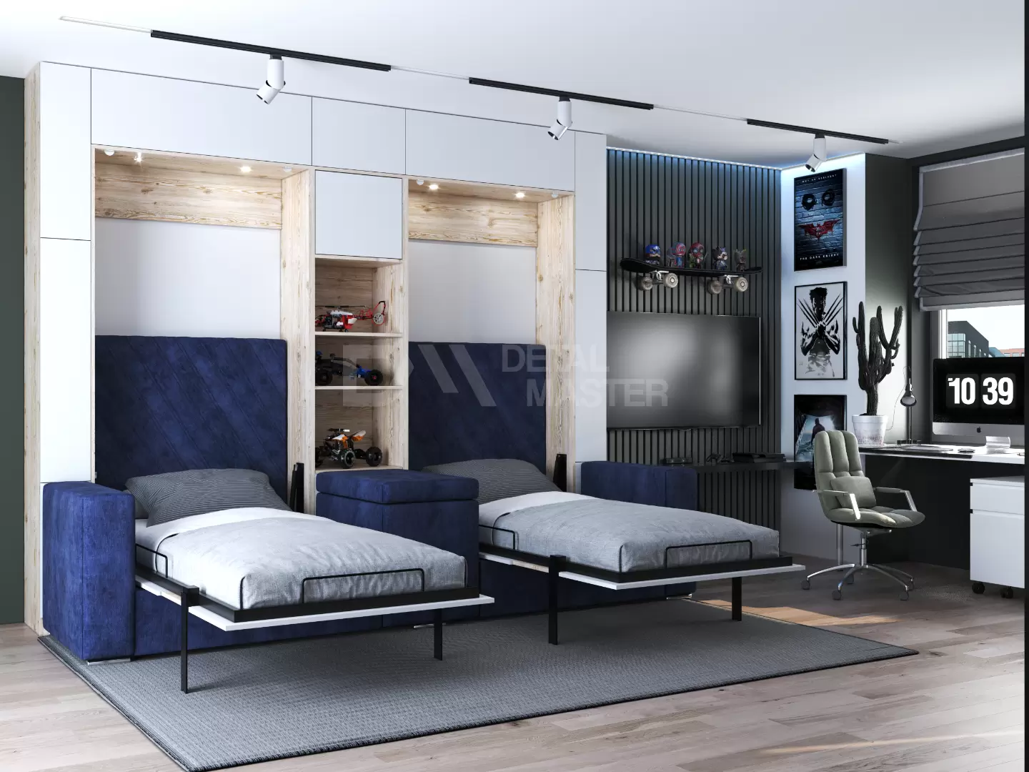 Детская шкаф-кровать с двумя спальными местами  "Twin 2.0" работает на механизме раскладывания собственной разработки "Balance". Кровать раскладывается легким движением руки, превращаясь в полноценное спальное место. Просто потяните за ножку-маятник, которая самостоятельно фиксируется в нужное положение при опускании.